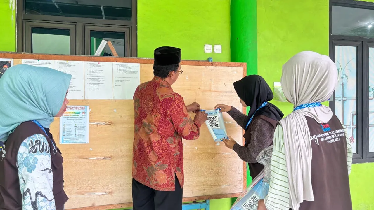 Mahasiswa KKN UPGRIS bersama Kepala Desa Mranggen memasang poster QR Code Pojok Baca Digital di papan informasi desa agar mudah diakses oleh masyarakat.