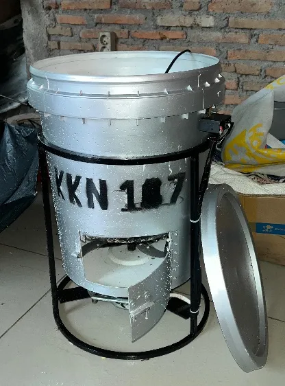 Secara teknis, alat pencacah menggunakan ember plastik bekas cat sebagai wadah utama yang difungsikan sebagai ruang pencacahan. Di dalamnya terpasang poros (shaft) vertikal yang dilengkapi empat mata pisau berbentuk lengkung dengan susunan simetris. Konfigurasi pisau ini dirancang untuk menghasilkan gaya potong yang merata sehingga proses pencacahan menjadi lebih efisien.